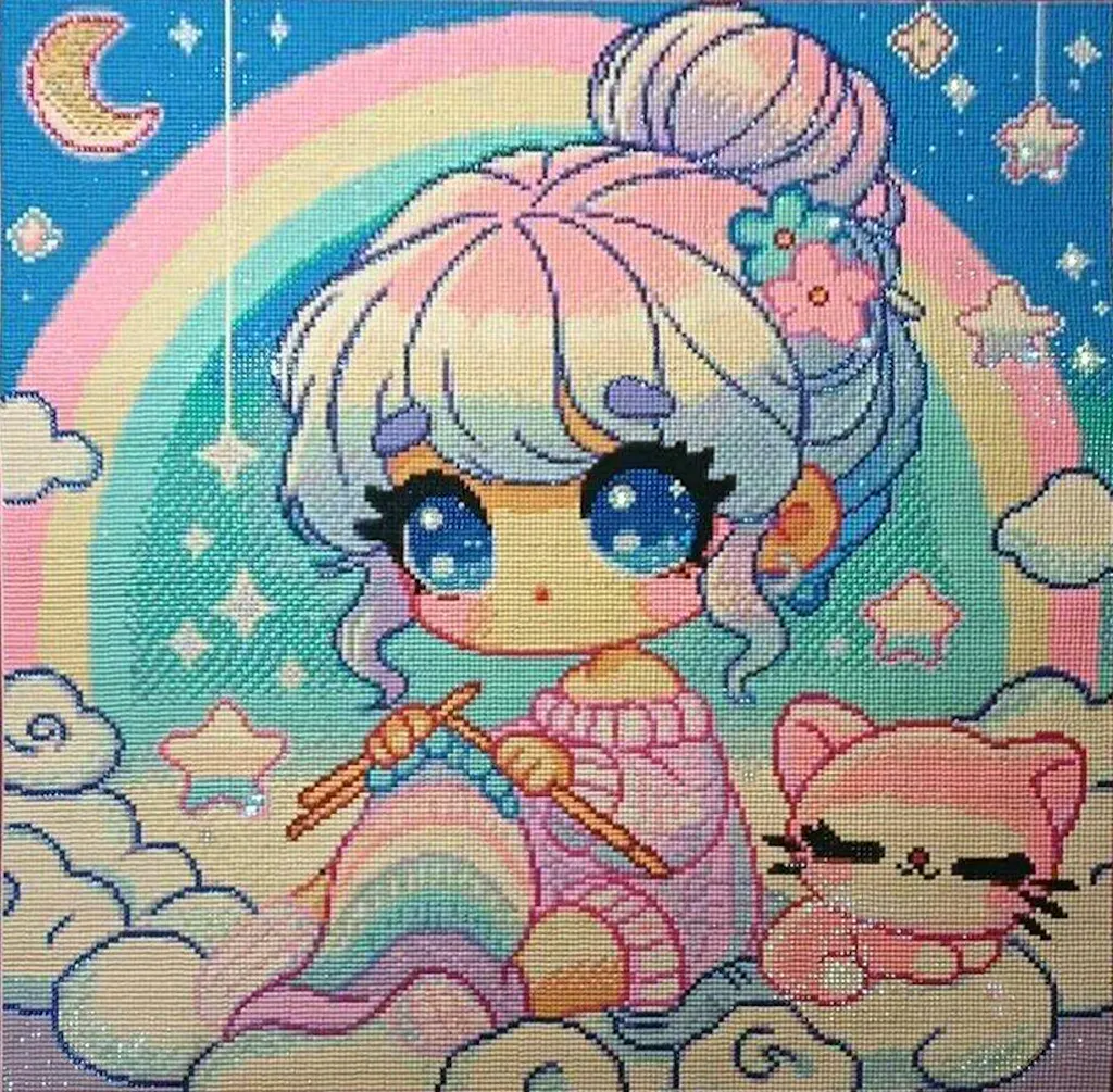 Hoch oben im Regenbogenhimmel, auf einer Wolke so weich wie Zuckerwatte, sitzt sie und strickt mit Fäden aus purem Sternenlicht und Pastellfarben. Masche für Masche entsteht unter ihren flinken Nadeln ein Stück des Himmelszelts, während ihr kleines rosa Kätzchen zufrieden schnurrt.